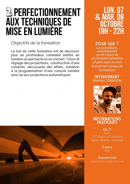 Le but de cette formation est de découvrir plus en profondeur comment mettre en lumière un spectacle ou un concert : Choix et réglage des projecteurs, construction d’une conduite, découverte des effets, initiation à la programmation d’une console lumière ainsi qu’aux projecteurs automatiques.